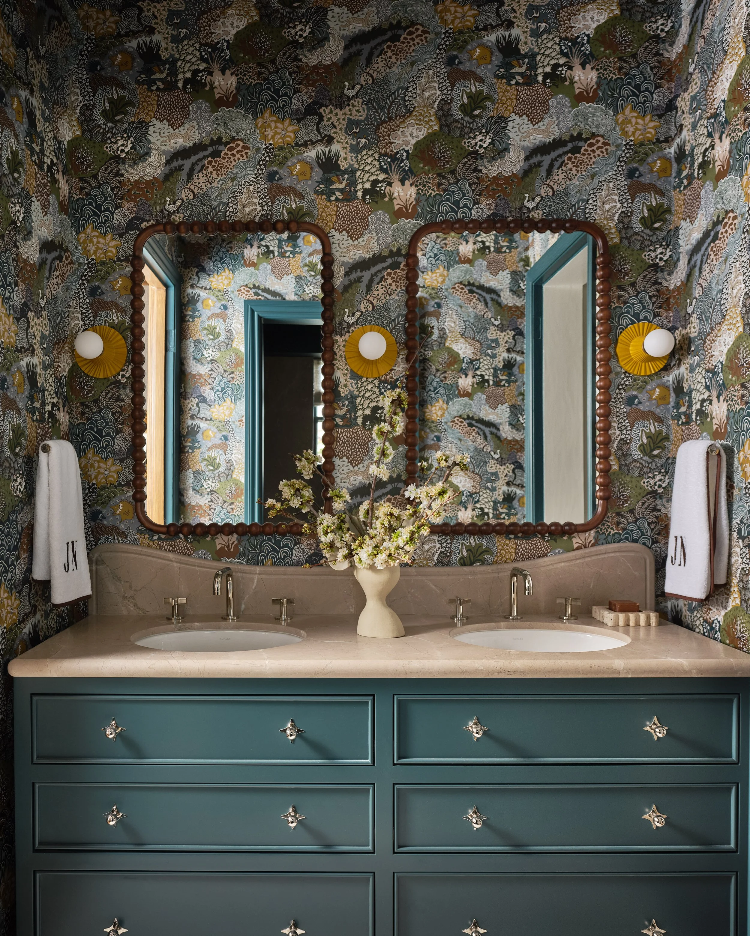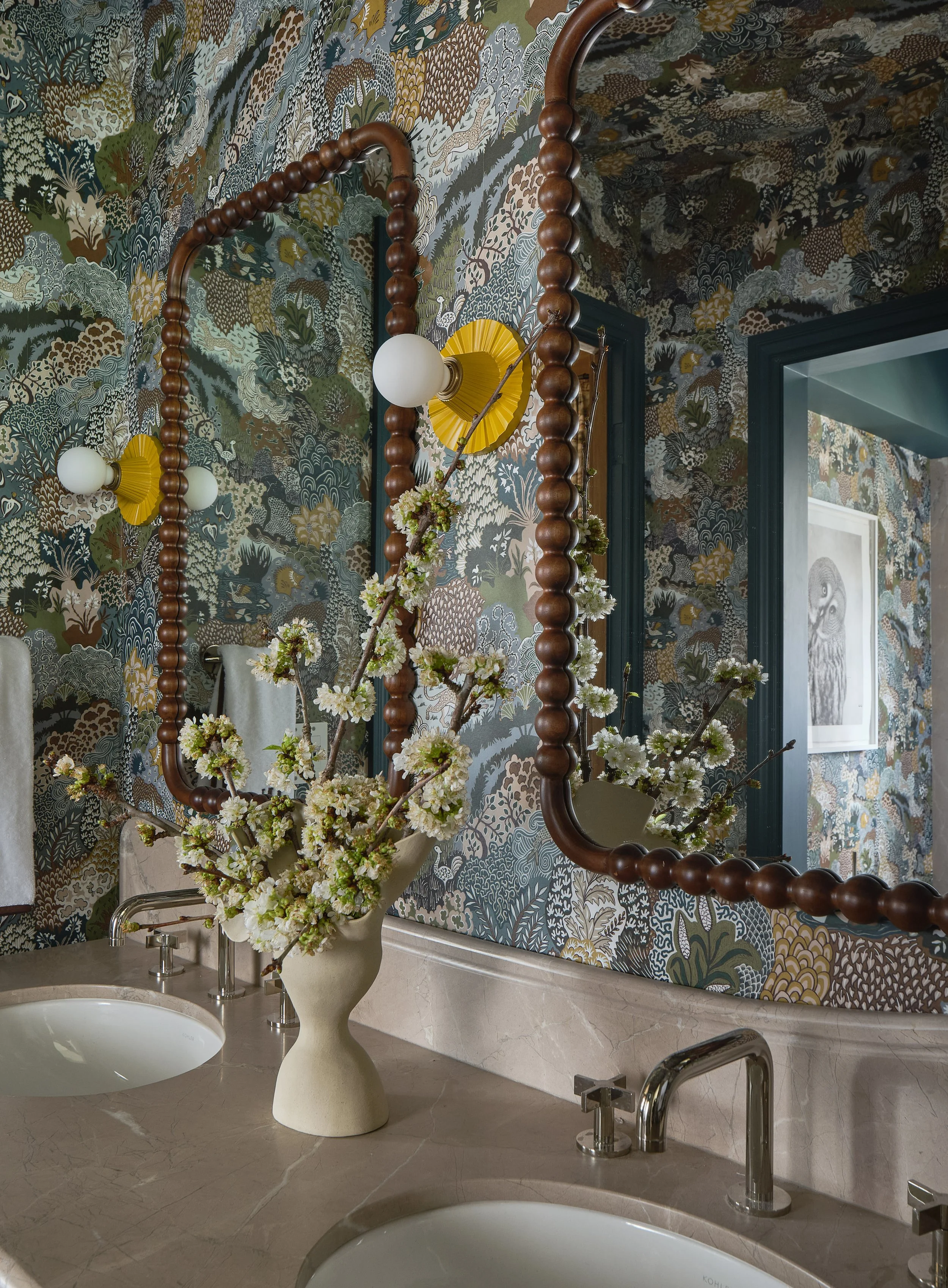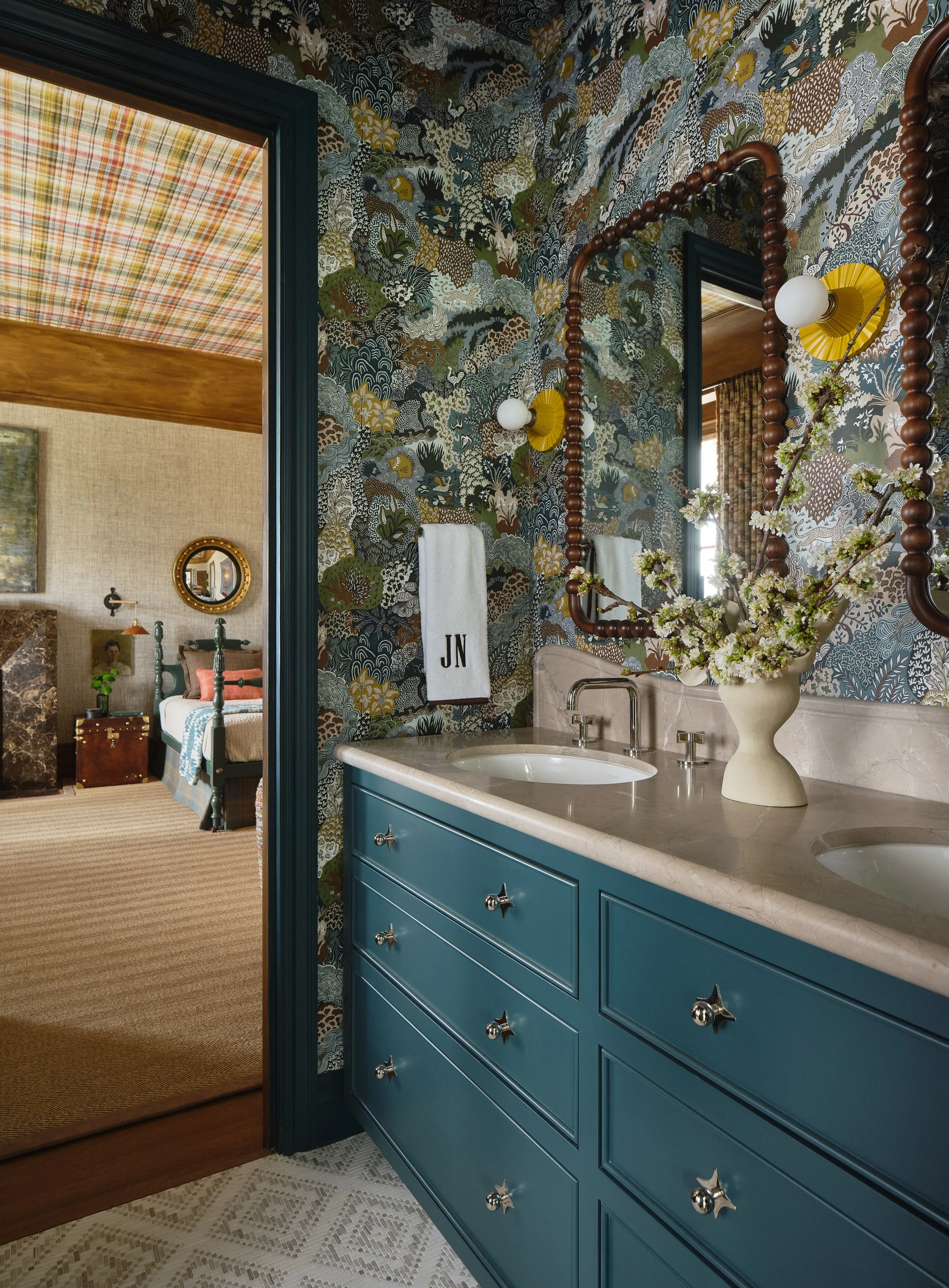 That felt like the right starting point for a Jack and Jill bath shared between two rooms. It also connects naturally to the spirit of the bedroom beyond, where classic ideas are interpreted with a lighter touch. Once the wallpaper was in place, the rest of the room came together to support it. Saffron Beata Heuman sconces add a playful punch of color, while the vanity, with its exaggerated feet and curved backsplash, introduces a sense of character and charm.