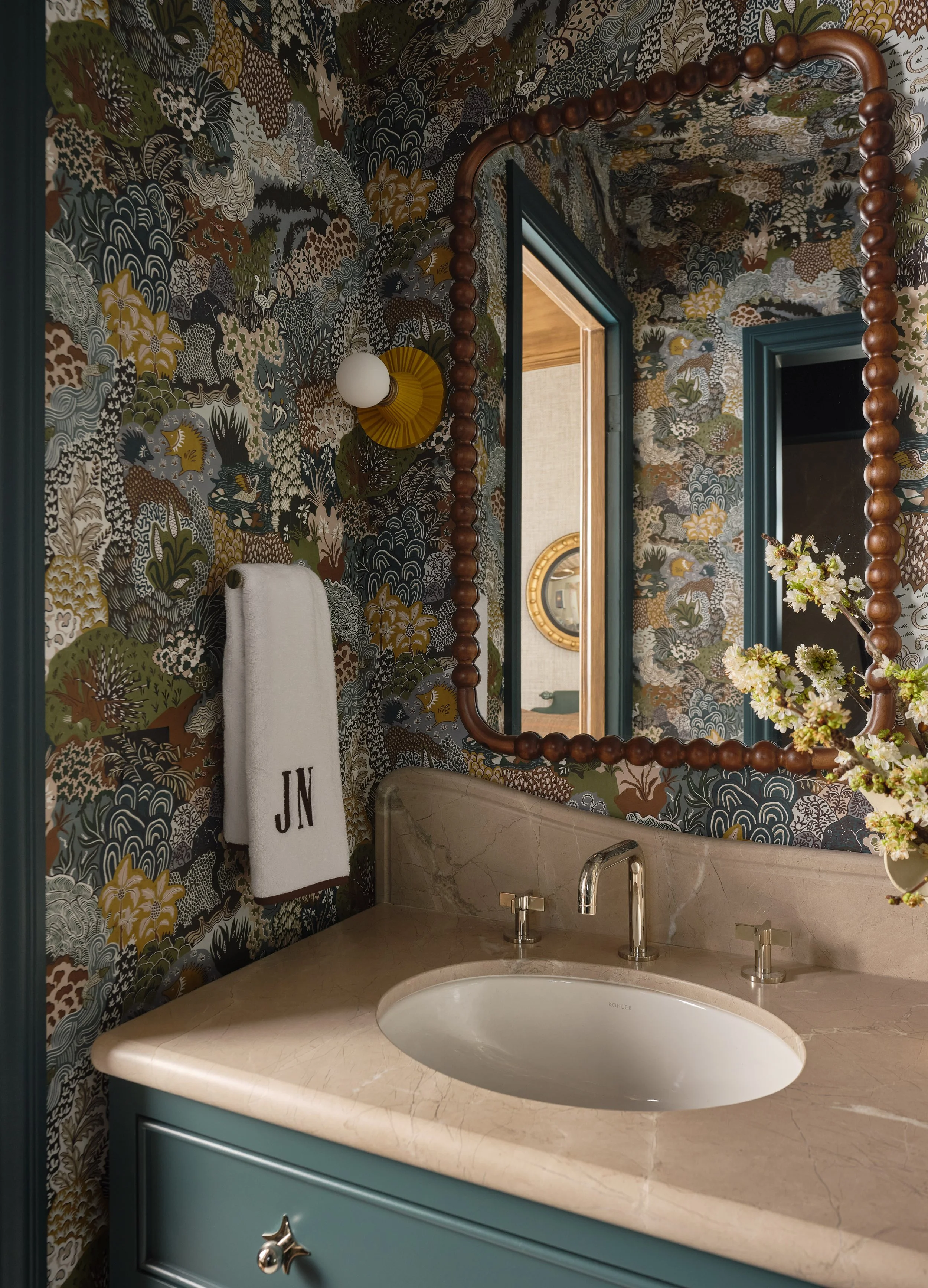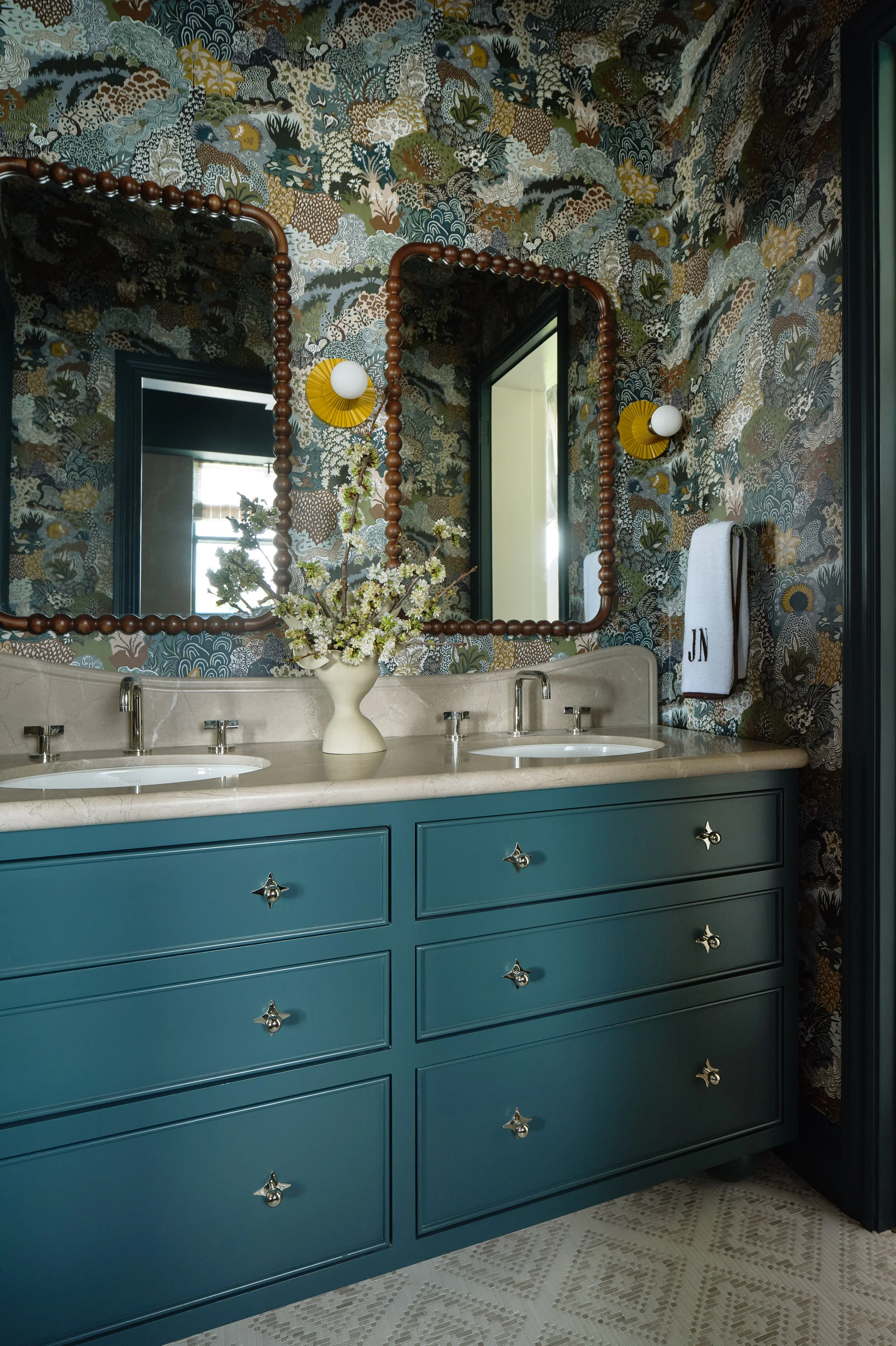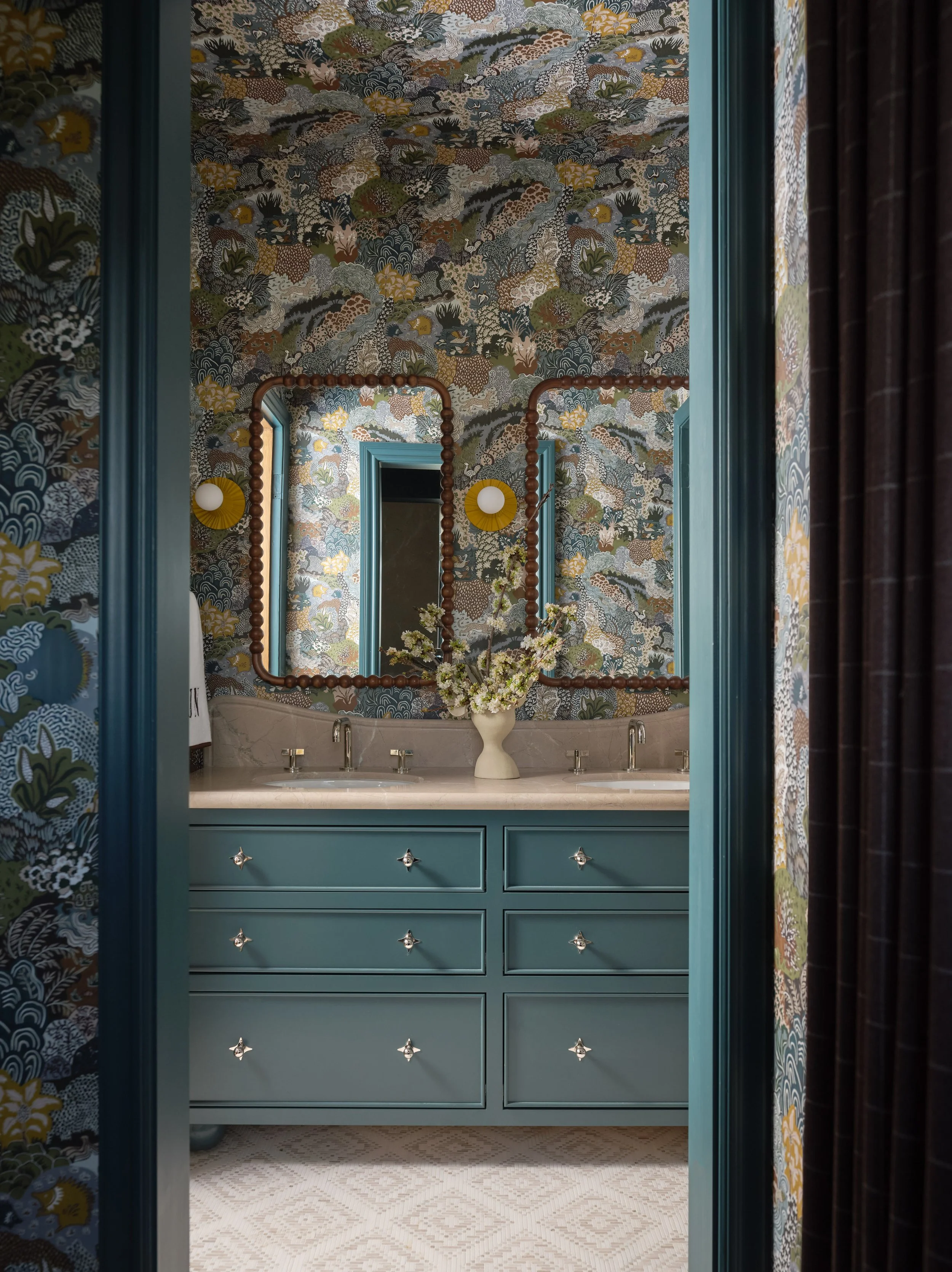 That felt like the right starting point for a Jack and Jill bath shared between two rooms. It also connects naturally to the spirit of the bedroom beyond, where classic ideas are interpreted with a lighter touch. Once the wallpaper was in place, the rest of the room came together to support it. Saffron Beata Heuman sconces add a playful punch of color, while the vanity, with its exaggerated feet and curved backsplash, introduces a sense of character and charm.