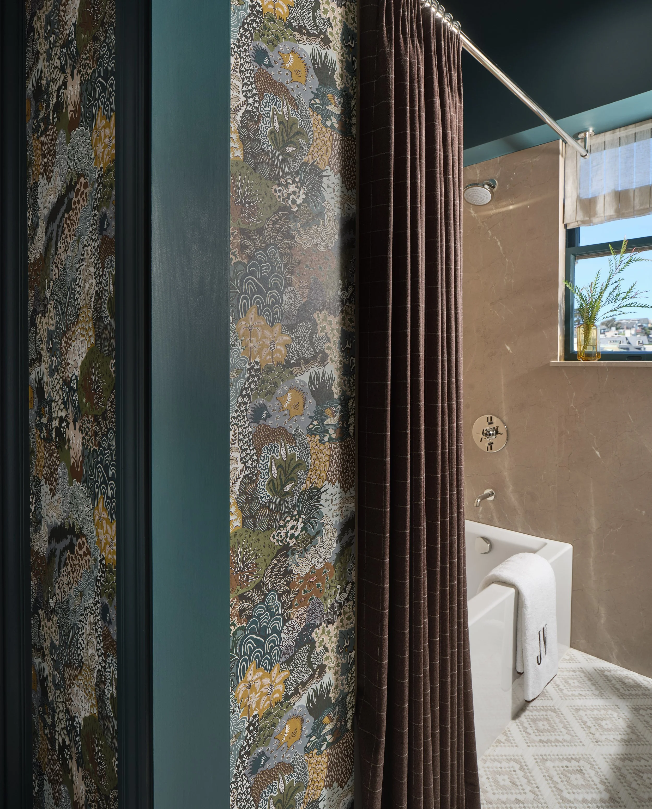 When Jeffrey first saw Josephine Munsey’s Whimsical Clumps, he didn’t see a bathroom. He saw atmosphere. The pattern feels painterly and alive, full of movement and quiet humor. Munsey, a UK designer, hand-draws her patterns from years of personal sketchbooks, drawing inspiration from travel, exhibitions, her mother’s collection of ferns, and the woods surrounding her studio. You can feel that sense of nature and imagination in the pattern, which is exactly what drew Jeffrey to it.