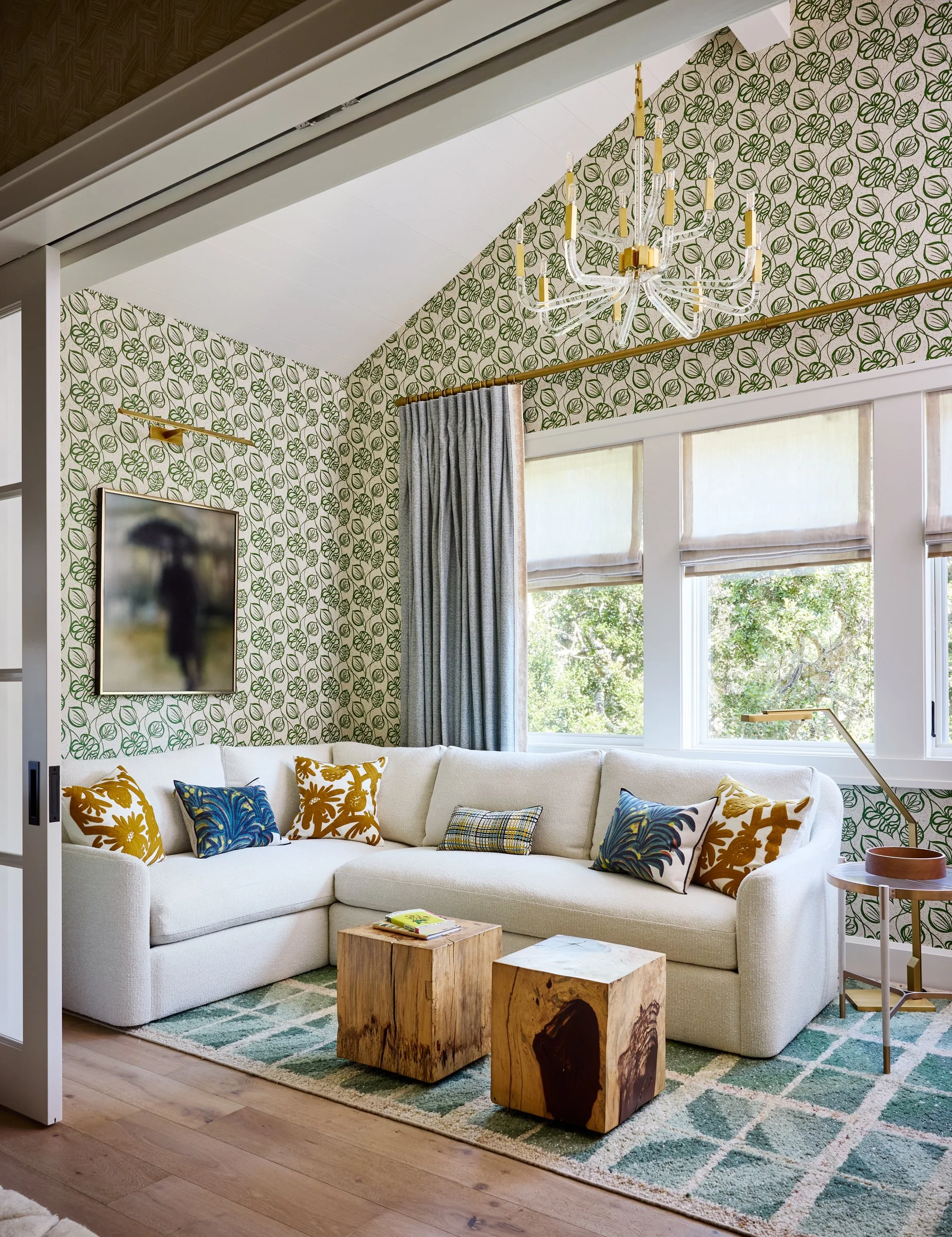 Main House Living Room, Cabinet View features ceiling and trim painted Benjamin Moore OC-85 Mayonnaise, with a TV cabinet painted in OC-85 and BM 803 Lazy Sunday and glazed by Caroline Lizarraga. Wallpaper is by Phillip Jeffries, and drapery is in Kneedler Fauchère, Pierre Frey fabrics with trim from Kneedler Fauchère, Samuel & Sons. A chandelier by Hewn, Bella Figura illuminates the space, with the fireplace clad in Zeus Quartzite from IRG. Seating includes chairs by Palecek with fabrics from De Sousa Hughes, Élitis, and Perennials, and a sofa by Matt O’Reilly Furniture upholstered in Hewn, Mokum fabric with pillows in Kneedler Fauchère, Pierre Frey, Shears & Window, Madeaux, and Perennials fabrics. Throw blankets are from De Sousa Hughes, Rosemary Hallgarten. Side tables are by Una Malan and Tom Faulkner, with a coffee table by Holly Hunt, Christian Astuguevieille. Vases in the cabinet are from Found by Maja, Artemest Filadelfio Todaro, and Artemest ND Dolfi, with knob hardware by Matthew Studios. The room is anchored by a rug from Marc Phillips.