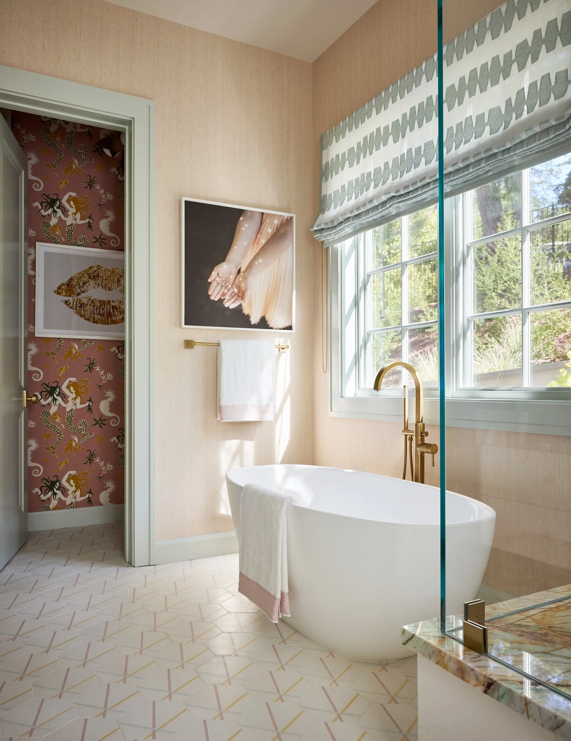 Main House Bath One, Part II features ceiling and cabinet paint in Benjamin Moore OC-17 White Dove, with wall tile from clé Tile and wallpaper by Holland & Sherry, Kneedler Fauchère. Roman sheers are in De Sousa Hughes, Filippo Uecher fabric with tape from Kneedler Fauchère, Samuel & Sons. Fixtures include a faucet by Sigma via Ferguson and a tub from House of Rohl. The vanity is topped with Dumont Quartzite from IRG, and the floor is finished in Waterworks tile. Artwork by Ranahan Art, Austin Eddy completes the space.