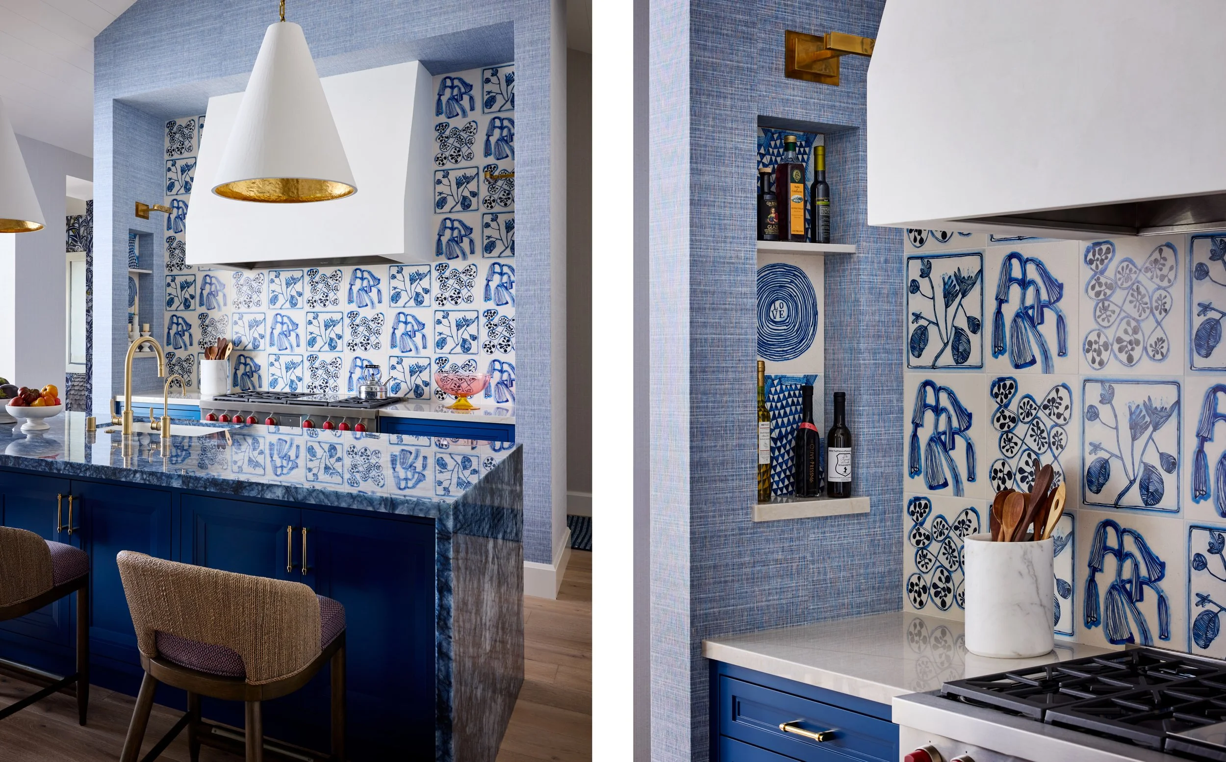 Main House Kitchen features ceiling and trim painted Benjamin Moore OC-85 Mayonnaise, with wallpaper by Phillip Jeffries. Lighting includes pendants by Rose Uniacke and art lights from Visual Comfort. The backsplash is by clé Tile, Ruan Hoffman, and countertops are Zeus Quartzite from IRG, with faucets from Perrin and Rowe via Ferguson. Cabinetry is painted 744 Newport by C2 Paint, with an island in Crystal Blue Quartzite from IRG and pull hardware from Waterworks. Stools are upholstered in Holland & Sherry and Peter Dunham fabrics.