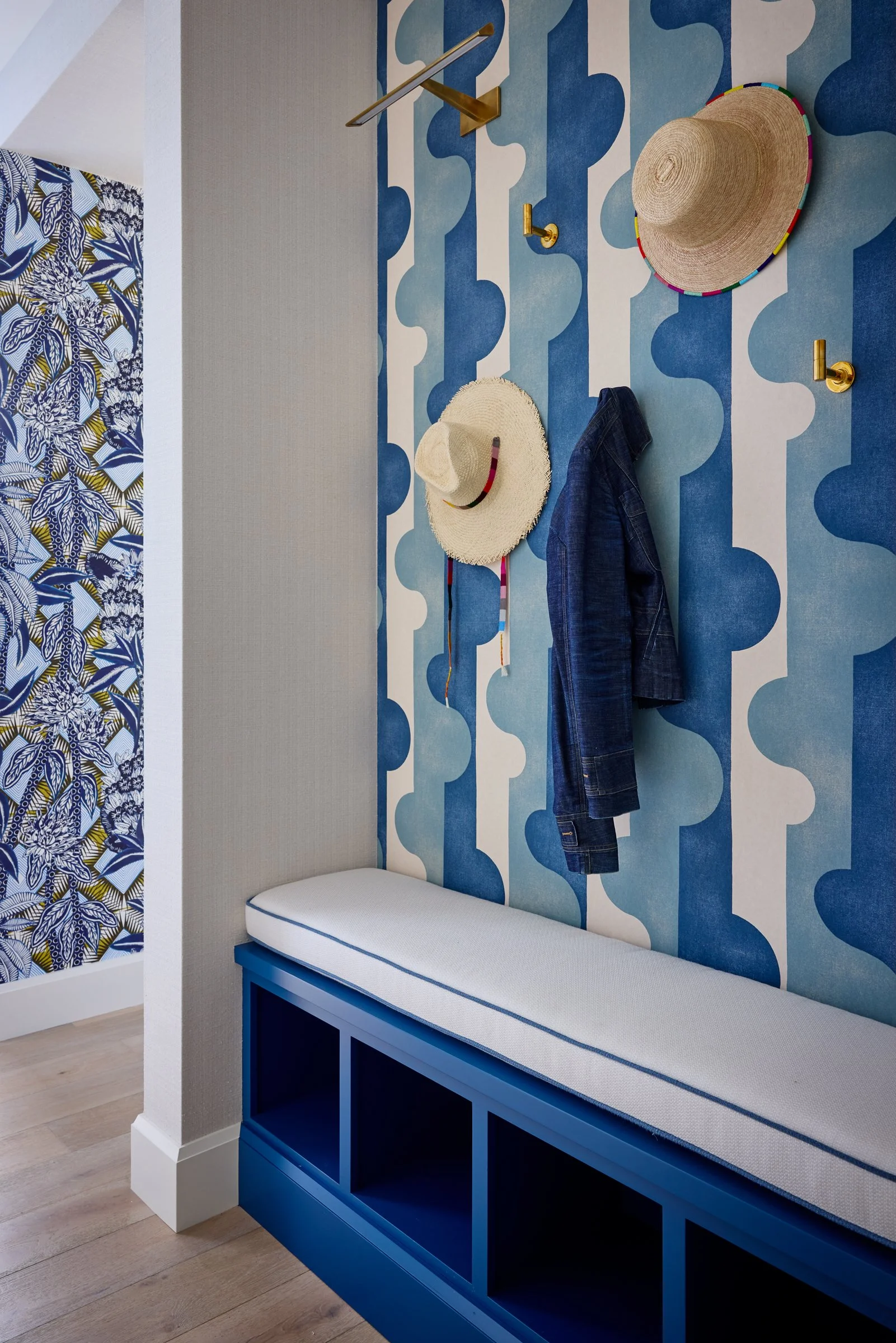 Mud Room features ceiling and trim painted Benjamin Moore OC-85 Mayonnaise, with wallpapers by Kneedler Fauchère, Pierre Frey, Phillip Jeffries, and a mudroom wallpaper by De Sousa Hughes, Romo. Lighting includes art lights from Visual Comfort, and wall hooks are from Waterworks. The bench cabinet is painted 744 Newport by C2 Paint, with a custom cushion by Matt O’Reilly upholstered in Kneedler Fauchère, Holly Hunt Great Outdoors fabric.