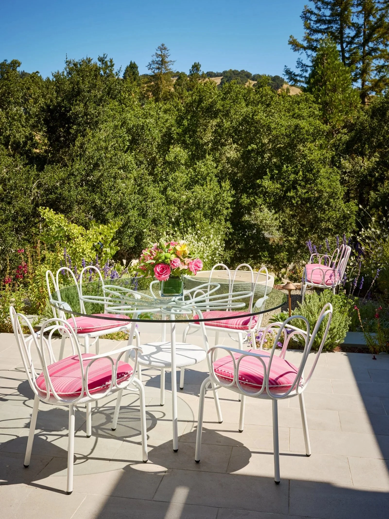 Main House Outdoor Sitting Area includes a table, chairs, and bench by Ago for Parafernalia. Chair and bench cushions were custom fabricated by Matt O’Reilly Furniture, upholstered in a Christopher Farr fabric sourced through De Sousa Hughes.