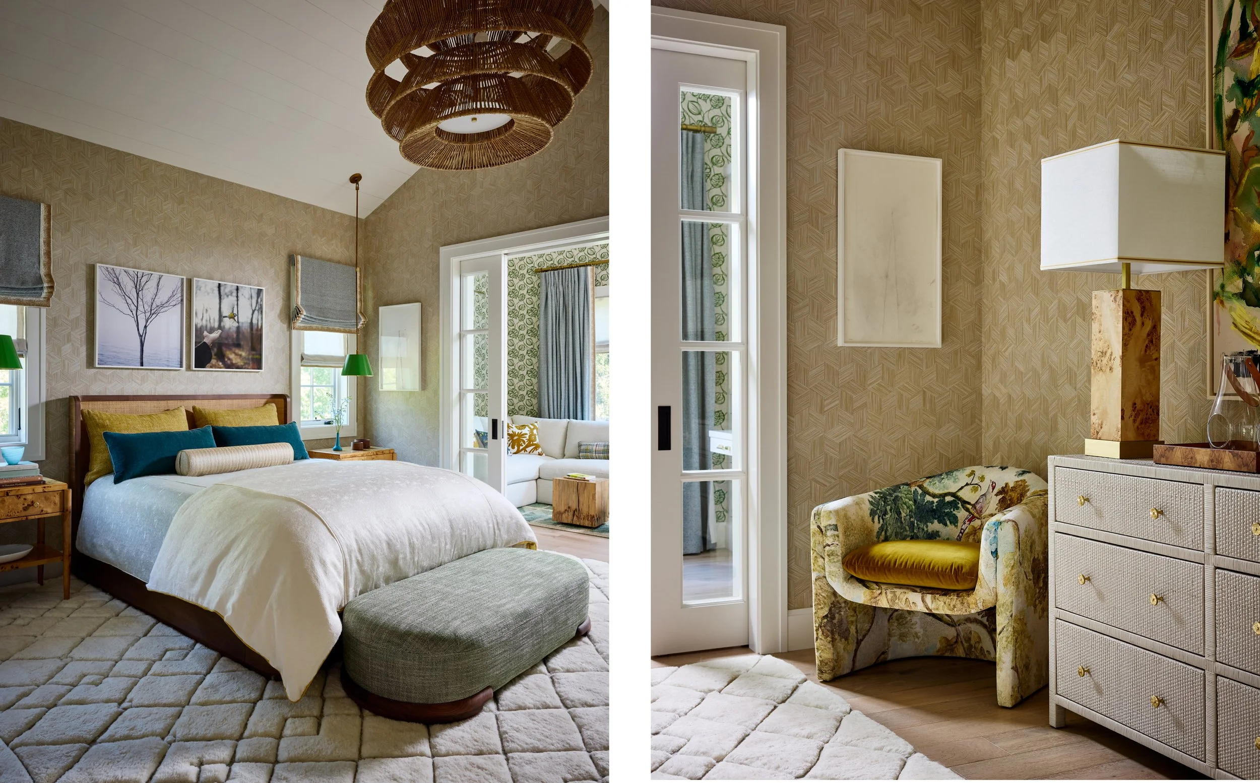 Main House Bed Two features ceiling paint in Benjamin Moore OC-17 White Dove and doors, window, and trim painted 845 Wildwood by C2 Paint, with wallpaper by Kneedler Fauchère, Pierre Frey. Lighting includes a pendant by Design Within Reach, Gubi, and side table pendants by Workstead. Roman shades are in Kneedler Fauchère, Holland & Sherry fabric with trim from Kneedler Fauchère, Holly Hunt Great Plains, while Roman sheers are in Kneedler Fauchère, Holly Hunt fabric with tape from Kneedler Fauchère, Clarence House. Side tables are from Restoration Hardware, with a bed and pillows by Matt O’Reilly Furniture upholstered in Natalie Mize Collective, Rubelli fabric with trim from Kneedler Fauchère, Holly Hunt. Pillow fabrics include Kneedler Fauchère, Kerry Joyce and Natalie Mize Collective, Pollack, with trims from Kneedler Fauchère, Samuel & Sons, and a throw blanket by De Sousa Hughes, Rosemary Hallgarten. Ottomans by Matt O’Reilly Furniture are upholstered in Hewn, Fermoie fabric, and a cluster of three clear rock crystal objects from 1stDibs adorn a side table. The room is anchored by a rug from Erik Lindstrom, with artwork by Knorr.