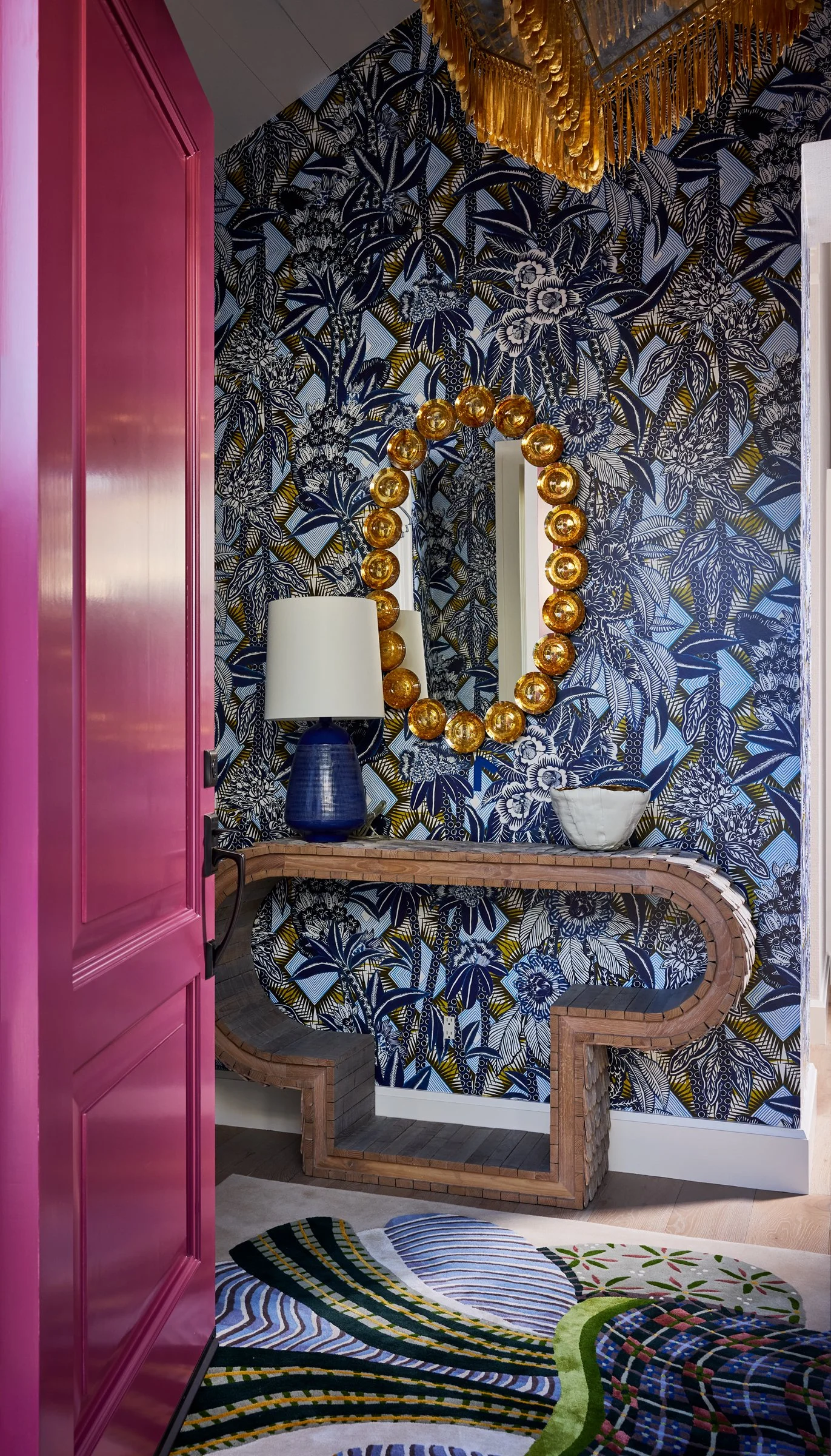 Main House Entry features ceiling paint in Benjamin Moore OC-17 White Dove and doors painted Benjamin Moore CSP-435 Modern Romance, with wallpaper by Kneedler Fauchère, Pierre Frey. A chandelier from Hewn by Fisher Weisman illuminates the space, complemented by a mirror from 1stDibs, Fratelli Tosi, and a lamp from Visual Comfort. The entry table is by Fumi Gallery, Voukenas Petrides & Lukas Wegwerth, topped with a bowl from Artemest, Paola Paronetto, and the space is anchored by a rug from Kneedler Fauchère, Pierre Frey.