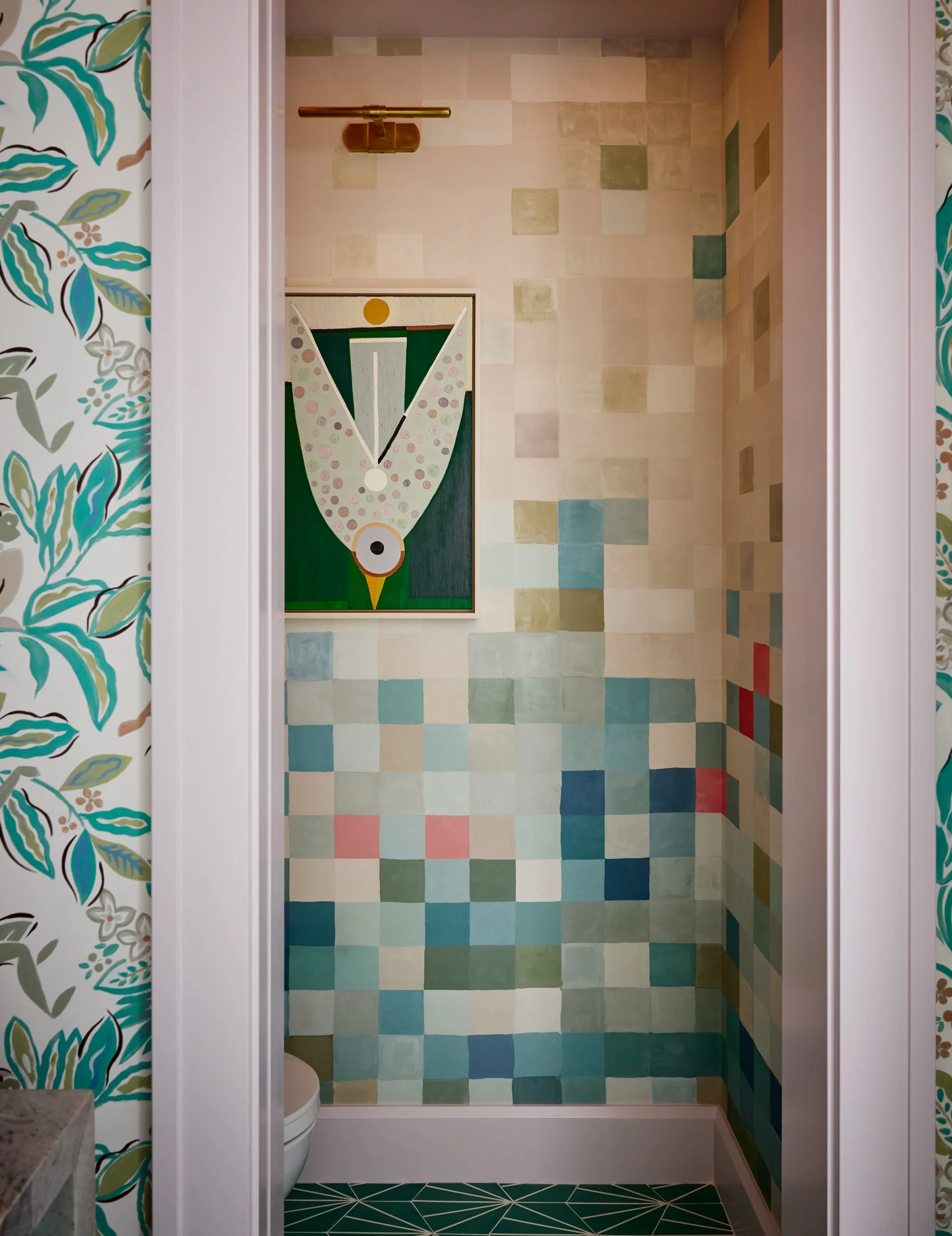 Main House Water Closet features wallpaper by Schumacher with trim painted Benjamin Moore 1387 Rock Harbor Violet. Lighting includes an art light from Visual Comfort and a pendant from Urban Electric. Artwork is by Austin Eddie, and the floor is finished in clé Tile.