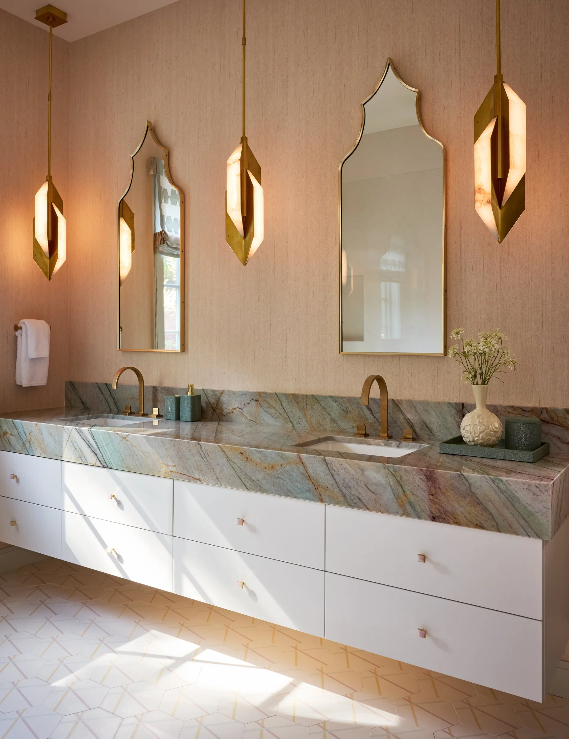 Main House Bath Two, Part I features ceiling and cabinet paint in Benjamin Moore OC-17 White Dove, with wallpaper by De Sousa Hughes, Omexco. Lighting includes pendants from Visual Comfort, and vintage brass-framed arched pagoda keyhole-shaped Italian mirrors from 1stDibs. The vanity is topped with Aurora Borealis Quartzite from IRG, with faucets by Sigma via Ferguson and bath accessories from E. Braun. Knob hardware is by Modern Matter, and the floor is finished in clé Tile.