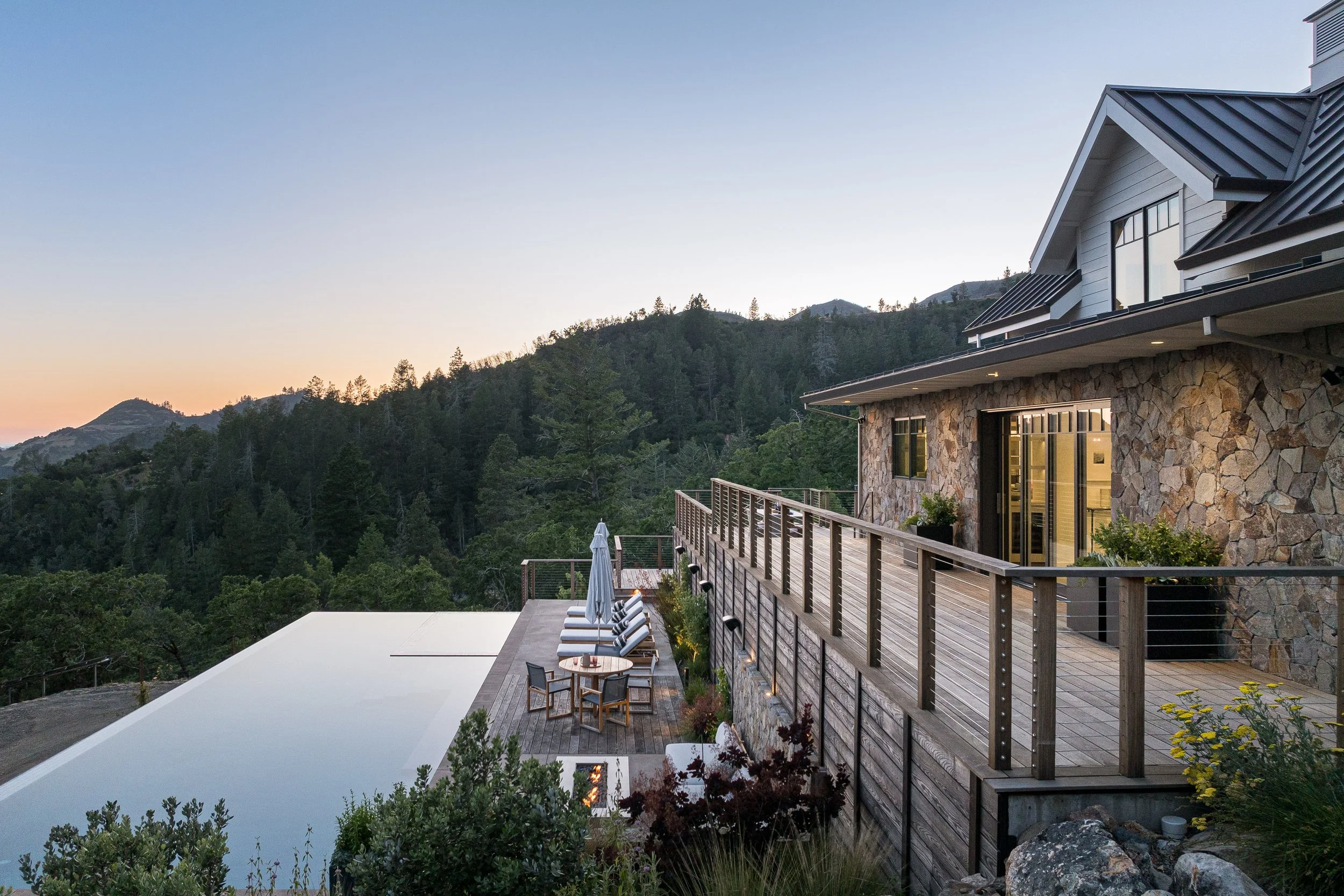 The original home was tiny but beloved. Rather than tearing it down, it was preserved with its traditional forms intact, while a new contemporary extension was built to bring in more light and volume. The addition includes an independent entrance to a yoga room and generous wine storage, befitting a vineyard property known for its premium estate-grown Cabernet. Multiple outdoor spaces were also created, with upper and lower decks tiering down the steeply sloping hillside. The upper deck houses an outdoor kitchen and dining area, while the lower deck hovers ten feet above a plateau with a new infinity pool amplifying the dramatic views. Vineyards surround a third outdoor area with a cozy picnic area, raised garden beds, and a pizza oven tucked into the retaining wall.